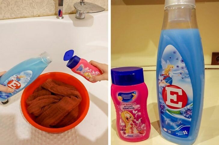2. Детский шампунь поможет «севшей» одежде. Мало кто знает, но простой детский шампунь способен вернуть «севшей» вещи ее первозданный вид. Для этого достаточно просто замочить ее на 10-15 минут.
