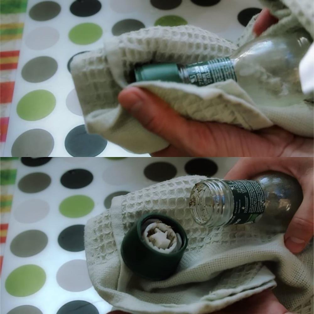 Обхватите крышку полотенцем и потяните — она с легкостью соскользнет.