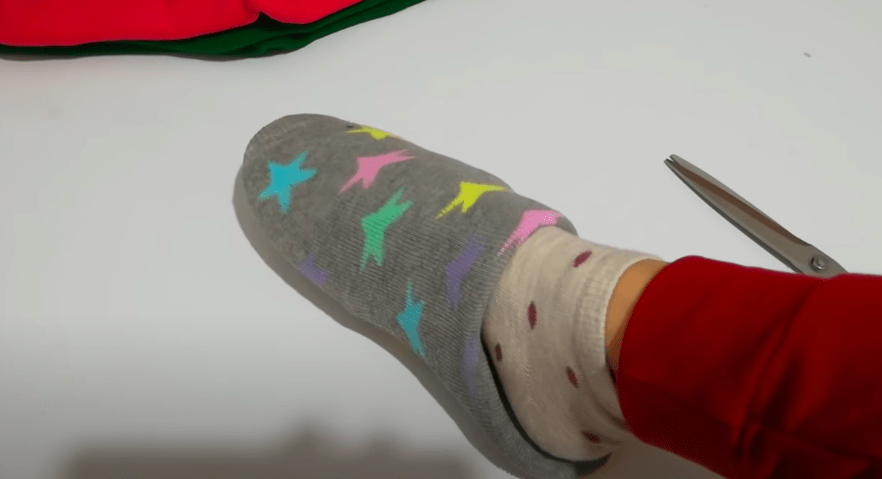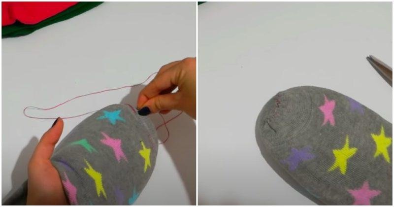 Все очень просто и шить практически ничего не придется. Первым делом выворачиваем носок наизнанку и надеваем его на ногу. Следом надеваем на ногу и тапок, а затем перетягиваем носок с ноги на тапок, так чтобы полностью его закрыть.