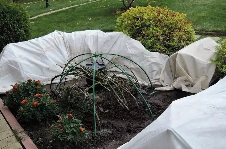 Я ценю и люблю все розовые кусты в своем саду, поэтому подготавливаю укрытие для каждого из них. Моя жена даже нашила для кустиков специальные мешочки из спанбонда.