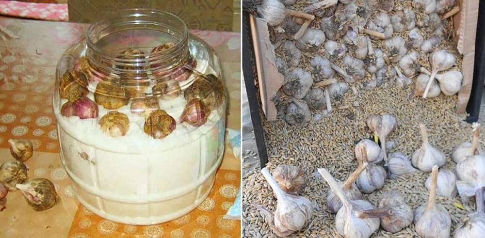 Другой способ спасти чеснок от влаги — использовать опилки, зерно, золу или муку вместо соли с тем условием, чтобы верхний слой сыпучего продукта был толщиной не меньше, чем 2 см.