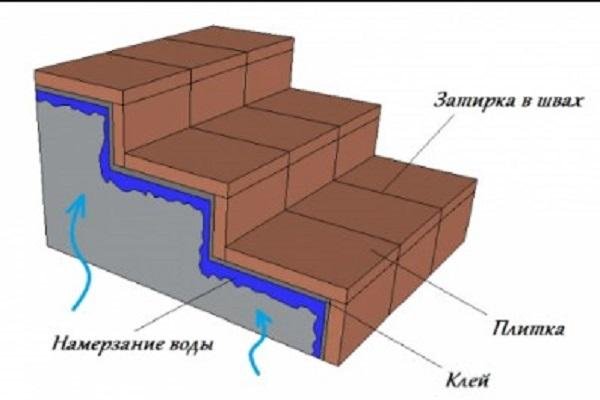 Под плиткой начинает накапливаться влага, а при температуре ниже нуля замерзает, слегка отрывая плитку.