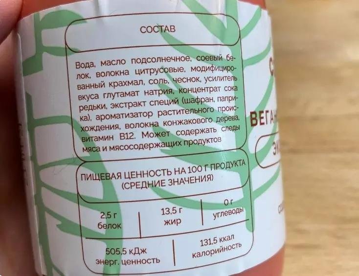 Первой в списке стоит вода, а это уже о многом свидетельствует. Еще для чего-то в колбасу добавили сок редьки и волокна конжакового дерева.