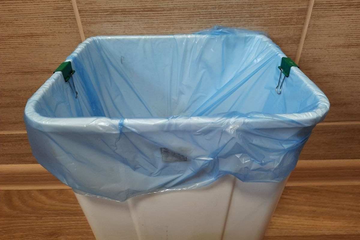 А чтобы пакеты лучше держались и не соскальзывали вглубь ведра, их можно закрепить канцелярским зажимом. Это простое устройство называют прищепкой, большой скрепкой, биндером, крокодилом.