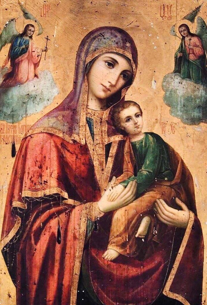 1. «Икона Троеручница». На ней изображена Богородица, которой пришлось сбегать от разбойников с младенцем на руках. Ей нужно было переплыть через реку, чтобы спасти себя и малыша.