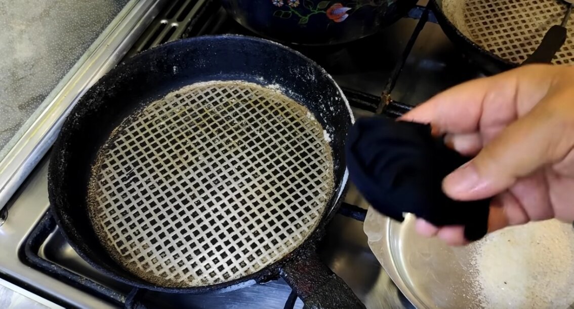 Затем сковородку нужно немного подержать на включенной плитой и протереть влажной тряпкой.
