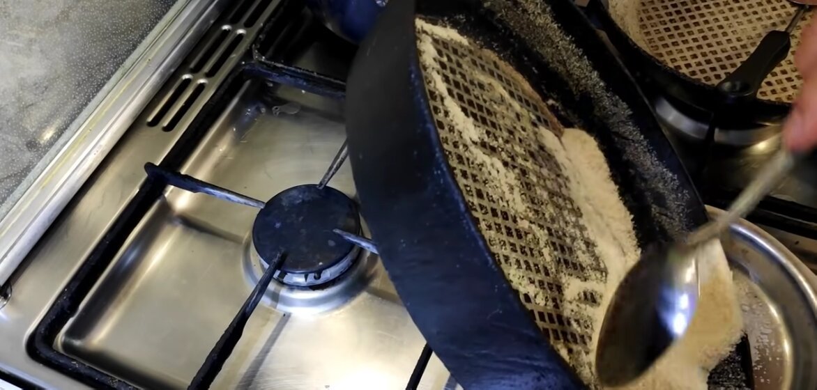 После чистки металл потеряет естественное антипригарное покрытие. Еда будет приставать, поэтому сковороду надо обработать.