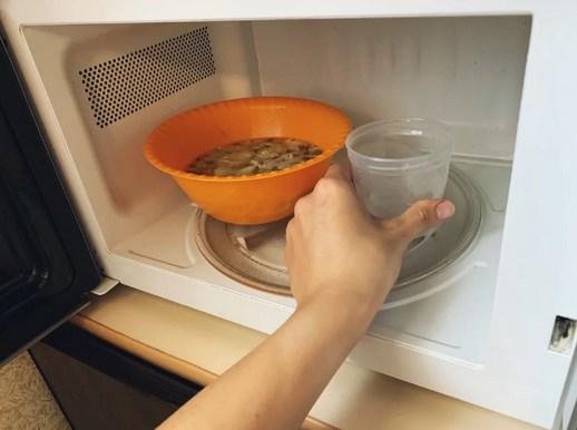 А легко разогреть 2 тарелки за раз можно следующим образом: Для этого нам понадобится стакан или кружка. Нужно поставить первую тарелку с едой на стеклянную поставку. Рядом ставим стакан.