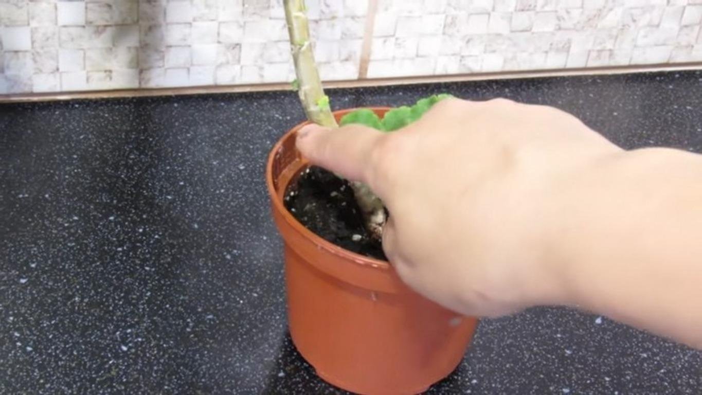 Укоренять черенок лучше сразу в грунт, а не ставить в стакан с водой, как это делали раньше с несортовыми видами пеларгонии. В почве делаем углубление (подойдёт любой универсальный грунт), вставляем в отверстие черенок и слегка обжимаем почву.