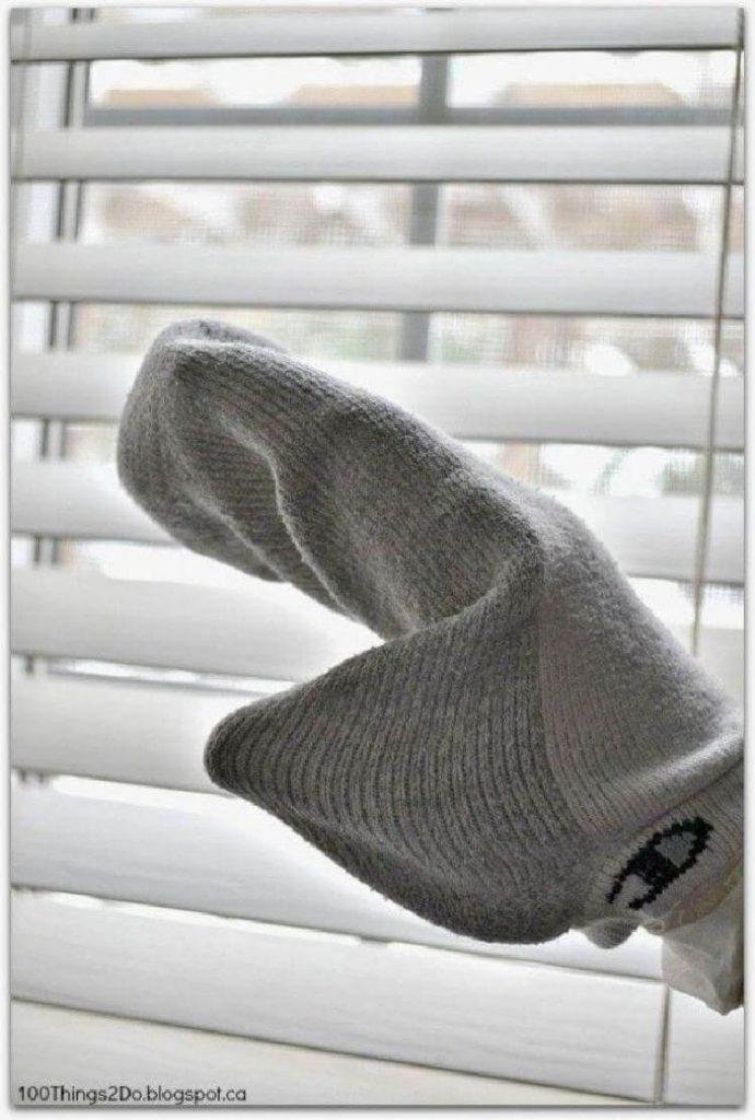 Случается, что один носок теряется. Не спешите выбрасывать оставшийся. Он очень удобный инструмент для, чтобы очистить от пыли жалюзи. Просто нанесите чистящее средство на жалюзи и проведите по ним носком, надетым на руку.