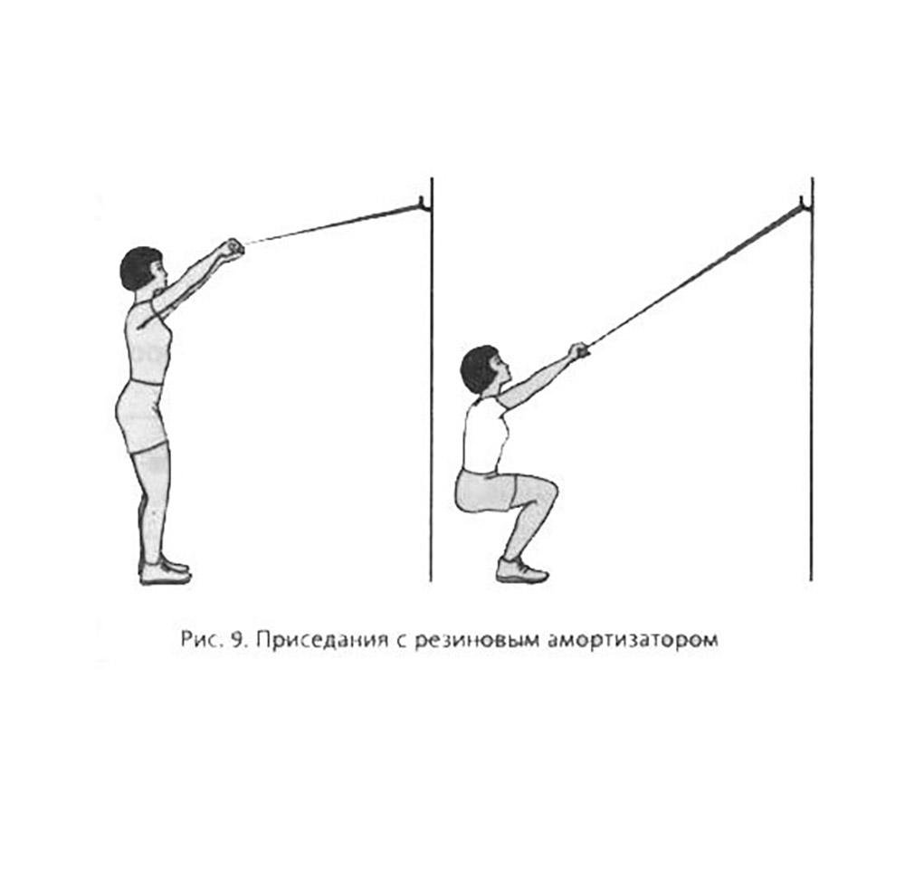 И еще о приседаниях. Лично я предпочитаю делать приседания с прямой спиной, держась за резиновые амортизаторы, закрепленные за неподвижную опору (рис. 9) или просто за шведскую стенку. Это позволяет выключить мышцы спины и включить только мышцы ног.