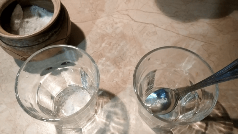 Берем 2 стакана, в каждый отправляем по половине чайной ложки соли и заливаем водой. Для первого стакана берем холодную воду, а для второго горячую.