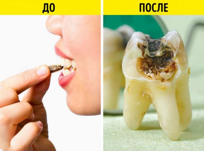 Если регулярно грызть семечки зубами, то такое механическое воздействие чревато разрушением эмали, а также приводит к образованию трещин и развитию кариеса. Как правило, страдают передние зубы, так что «красота» станет заметна незамедлительно.